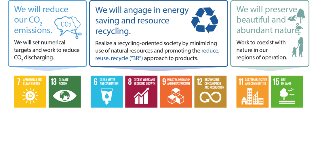 In our pursuit of sustainability (for the environment, society and the economy), we will actively develop and distribute SDG-oriented products while striving to achieve economic benefit as well as a contribution to the environment and society.