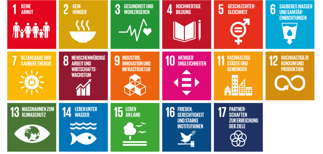 Wir orientieren uns an den in der Agenda 2030 von der UN festgelegten 17 Nachhaltigkeitszielen, die Sustainable Development Goals, kurz als SDGs bezeichnet.