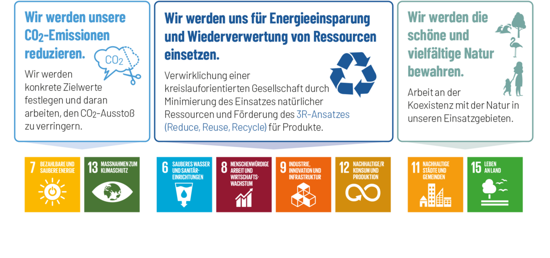 Wir werden im Streben nach Nachhaltigkeit (von Umwelt, Gesellschaft und Wirtschaft) aktiv SDG-orientierte Produkte entwickeln und verbreiten und streben sowohl wirtschaftlichen Nutzen als auch einen Beitrag für Umwelt und Gesellschaft an.