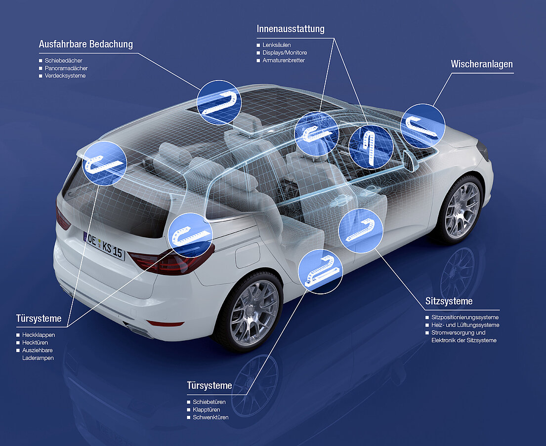Gesteigerter Fahrzeugkomfort sorgt für immer mehr bewegliche und elektrisch gesteuerte Funktionen. Unsere Produkte führen und schützen die dafür notwendigen sensiblen und filigranen Leitungen. Seit Jahrzehnten statten wir Fahrzeugtypen der unterschiedlichsten Marken mit unseren Energieführungen aus.