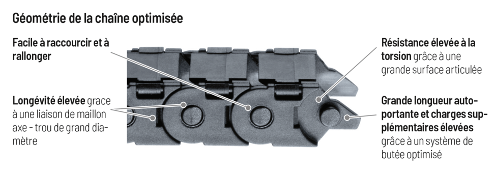 - Maillon en plastique faible poids avec une rigidité à la torsion particulière élevée.