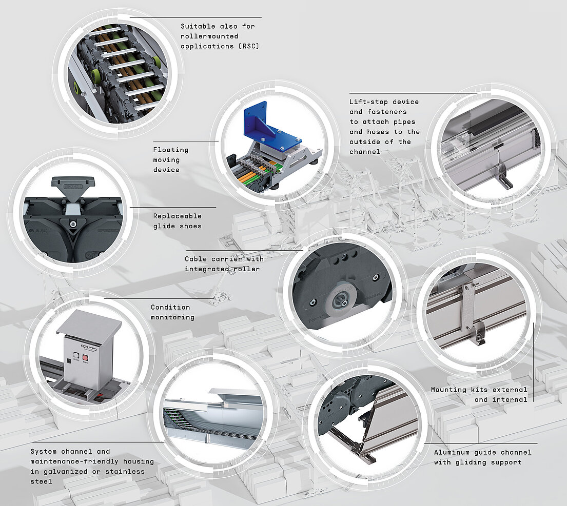 Container giants, powerful handling equipment, optimized loading times – nowadays the smooth and efficient handling of goods requires highly efficient crane systems with high cycle rates and high travel speed. That is exactly why we equip port cranes of any type and size with our lightweight and high-performance plastic cable carriers. Our products fulfill all requirements in terms of speed, acceleration and travel length. They are robust and durable and ensure smooth and safe crane operation in the harsh environment of a harbor – regardless the climatic conditions.