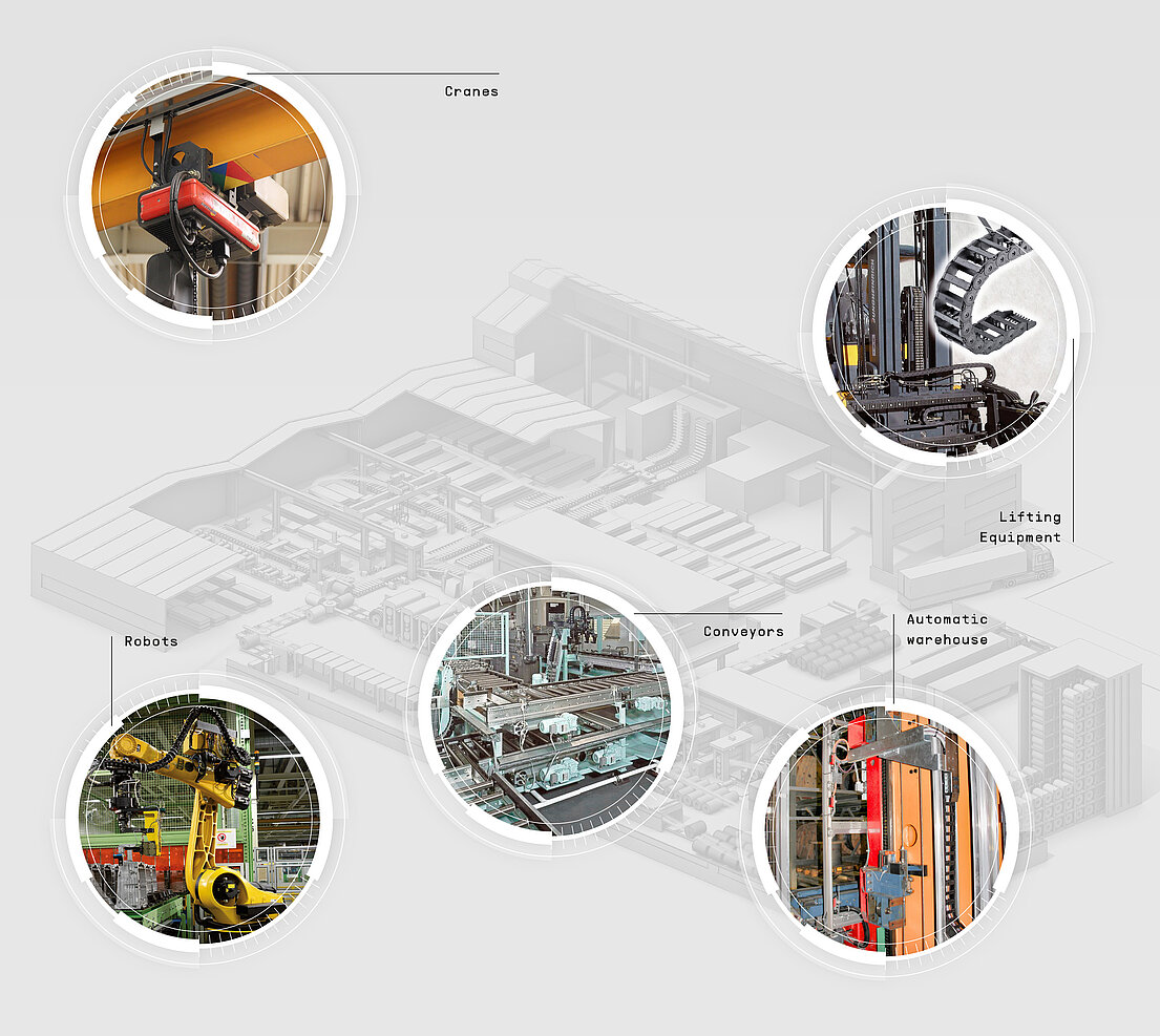 We consider ourselves as digitization assistant. Our products reliably protect sensitive data and power cables, while following all kinds of semi or fully automated movements. Whether lifting or conveyor technology, whether fully automatic rack pickers or overhead cranes – our wide product range covers the entire spectrum of intralogistic applications. Durable and especially designed for continuous use they sustain the internal production flow.
