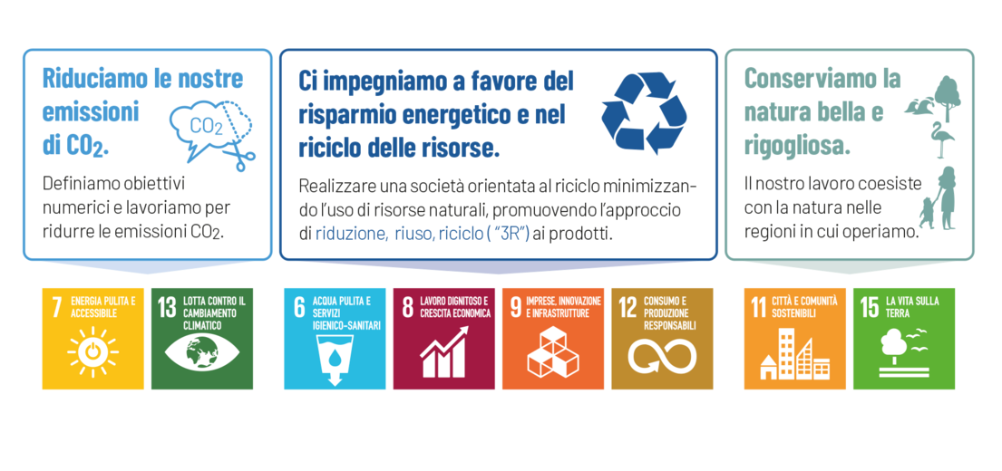 Nel perseguimento della sostenibilità (per l’ambiente, la società e l’economia), sviluppiamo e distribuiamo in modo attivo prodotti orientati allo sviluppo sostenibile, sforzandoci di ottenere benefici economici e un contributo per l’ambiente e per la società.