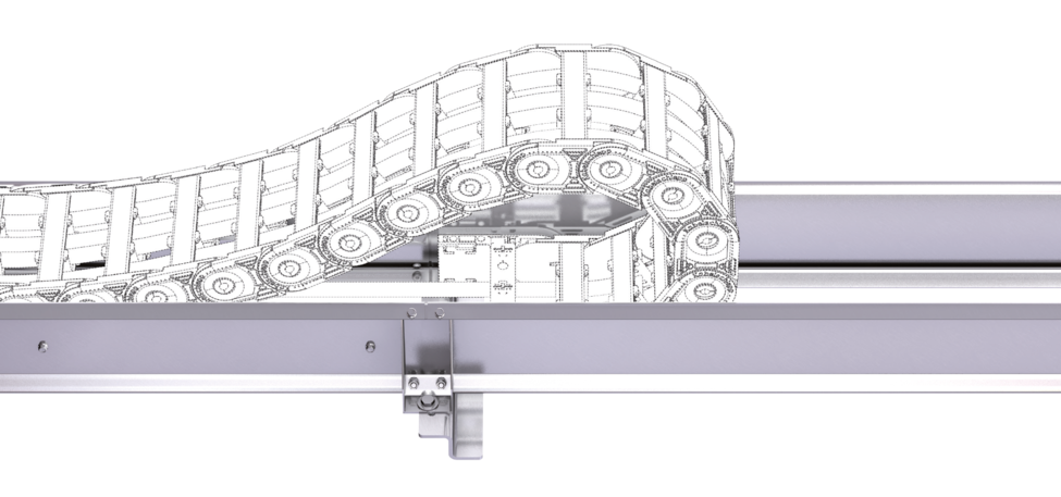 For one-sided arrangement of the cable carrier, the cable carrier slides behind the fixed point on a continuous slide support with run-off bevels.
