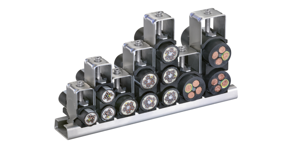 The standard sets of LineFix® clamps in size LF/LFX 12 offer even more flexibility and mounting options due to the extension with the new double and counter jaws. Optimized for different cable diameters and individually combinable heights, almost all requirements can be implemented without any problems.