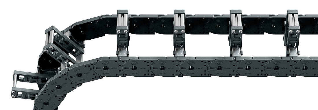 The cable carrier has to rest on the side bands and not on the stays. Guiding in a channel is required for support. Please contact our technical support at technik@kabelschlepp.de to find the corresponding guide channel. Please note the operating and installation height.