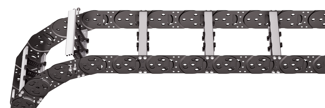- Aluminum profile bars for medium to heavy loads and large cable carrier widths. Double threaded joint on both sides.