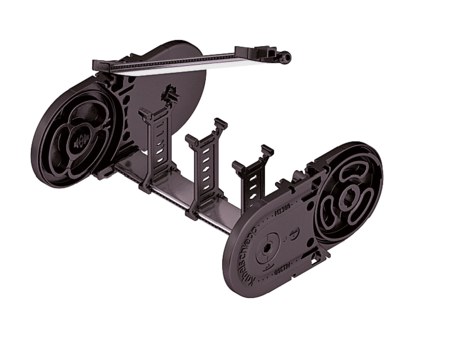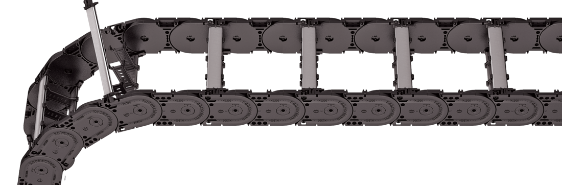 - Aluminum profile bars with plastic ball joint for heavy loads and large cable carrier widths. Assembly without screws.