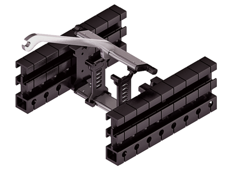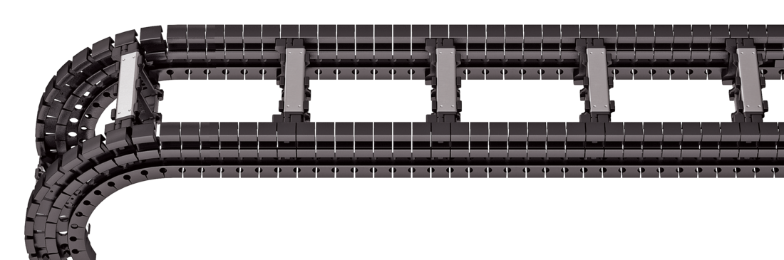 - Aluminum profile bars with plastic adapter for medium to high loads and large cable carrier widths. Assembly without screws.