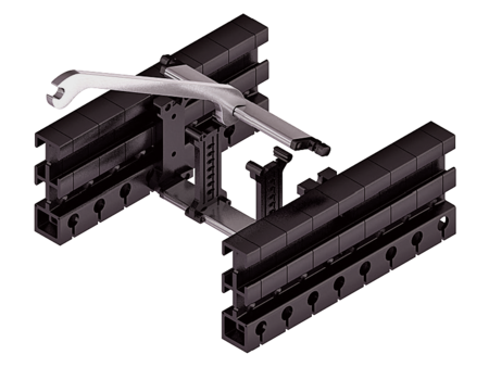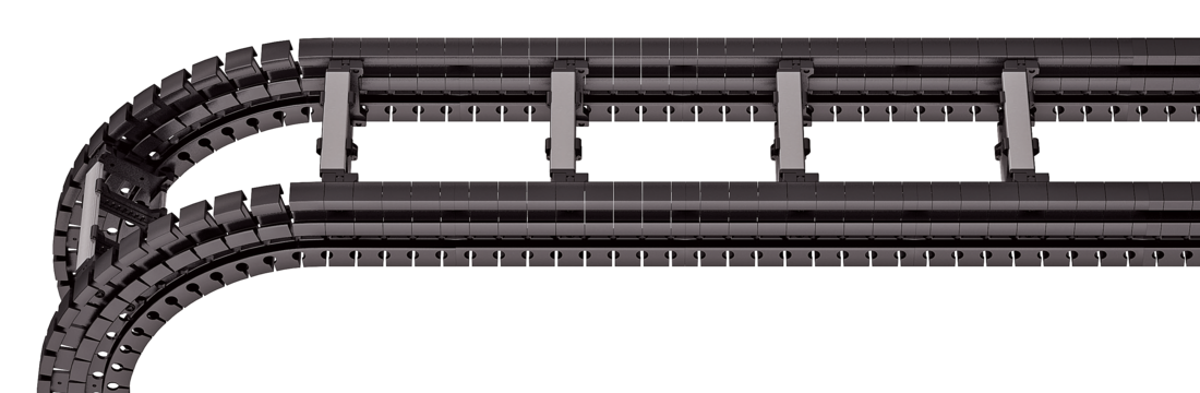 - Aluminum profile bars with plastic adapter for medium to high loads and large cable carrier widths. Assembly without screws.