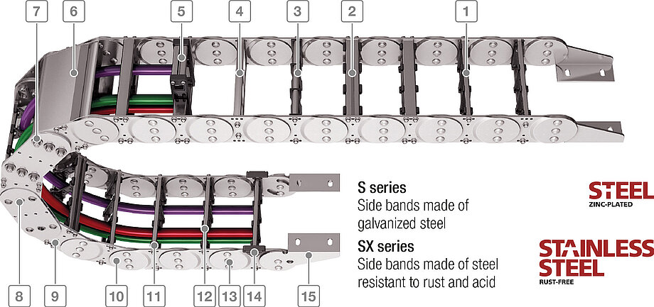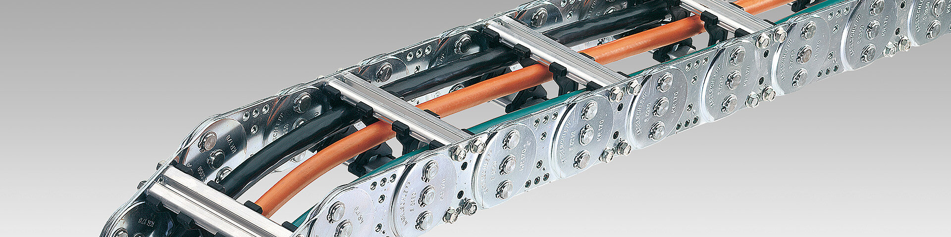 • Extremely robust, sturdy steel cable carriers for heavy mechanical loads and rough environmental conditions