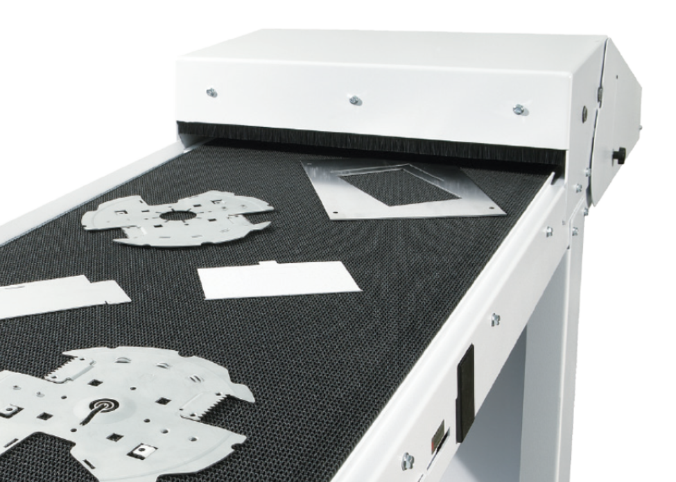 Conveyor systems for parts and residue management at punching or tube laser machines.