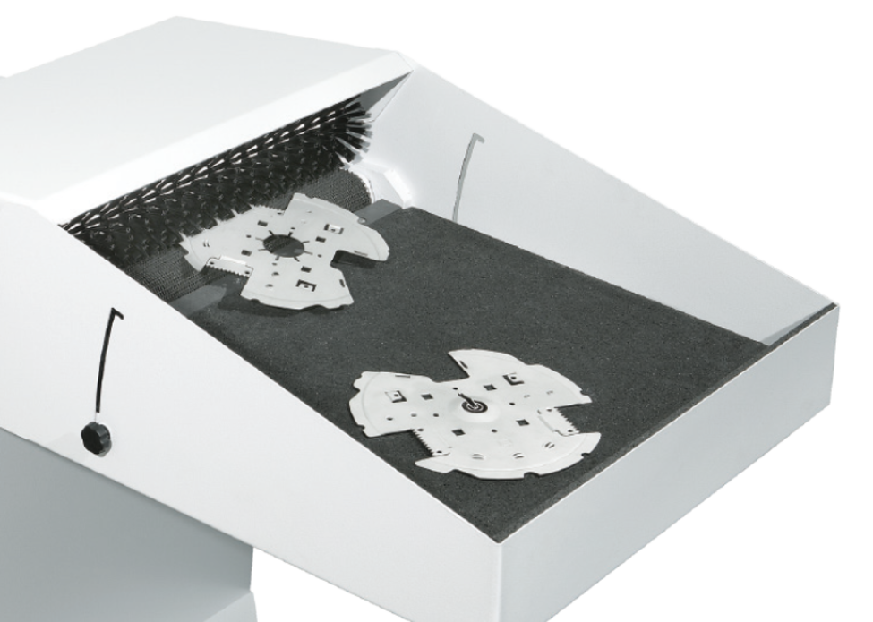 The parts conveyor provides the option of gently transporting parts with high standards for surface quality out into the required parts depot. The brush rollers in the discharge area ensure that the materials being transported are transfered to the parts depot virtually horizontally.