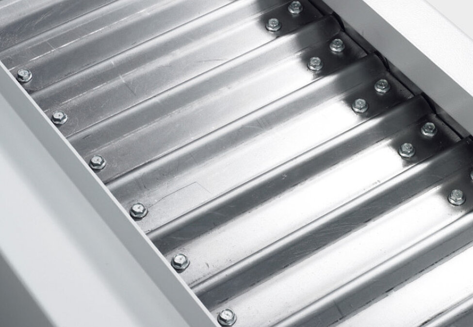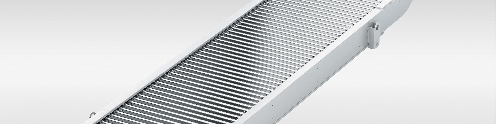 Chips and dirt can accumulate in the hinges in conventional hinged belts. The WAVE-BELT system is supplied without hinges on the top of the belt and is therefore smooth in this area. Chips and dirt cannot get jammed up. Due to the WAVE SHAPE of the belt plates, there is hardly any gap between the plates. This makes the belts denser, more durable and creates less maintenance. Further developed side boards avoid jamming of conveyed material and reduce the risk of wear and failure. The DST version is utilized as a standard application for the WAVE-BELT belt.