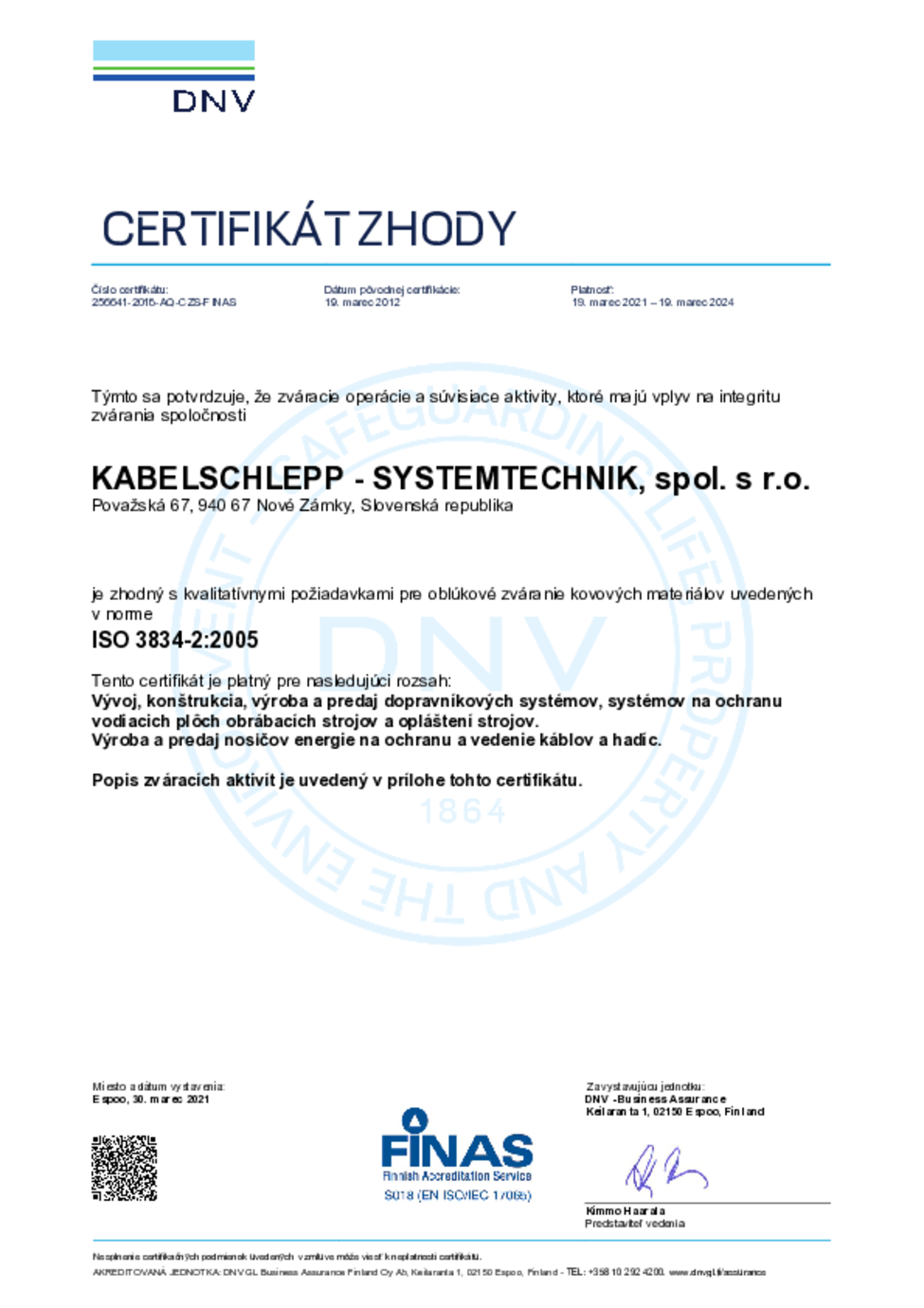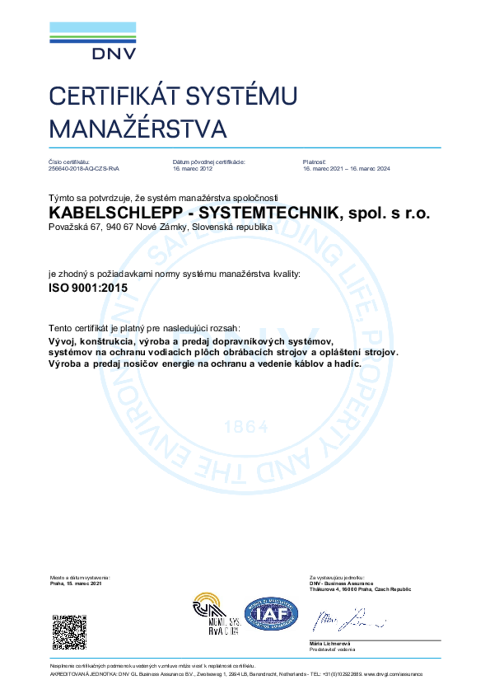 Od roku 1997 máme zavedený systém manažmentu kvality v prevádzke v súlade s normou DIN EN ISO 9001 a certifikovaný nezávislým orgánom. Okrem toho sa široký výber produktových radov systémov nosičov energie TSUBAKI KABELSCHLEPP podrobuje v pravidelných intervaloch konštrukčným skúškam TÜV Rheinland v súlade s 2PFG 1036 / 10/97.